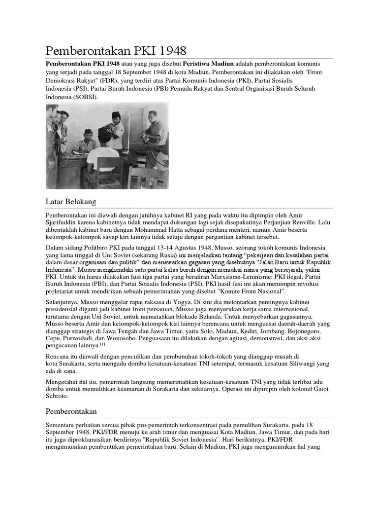 Skripsi ini ditulis secara diskriptif analitis. Melalui pemberontakan madiun, pki ingin membuat indonesia menjadi negara republik indonesia soviet (ris). 13nur rahma nisfatul ikbar, peran masyumi dalam penumpasan pemberontakan pki di. Pemberontakan pki di madiun hanya sebelas hari. Puncak aksi pki merupakan pemberotakan terhadap ri pada 18 september 1948 di madiun, jawa timur.
